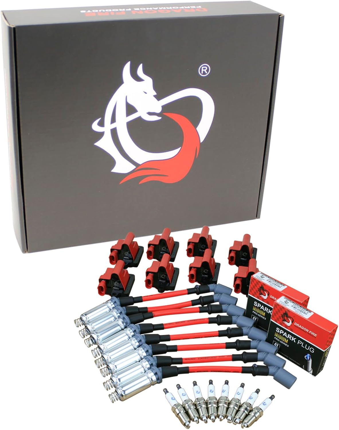 DRAGON FIRE PERFORMANCE Juego de encendido con bobinas de encendido cuadradas, bujías iridio y cables de bujía de 0.394 pulgadas compatible con