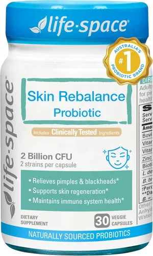 Alivio del acné clínicamente probado: Objetiva rupturas en la fuente: nuestra fórmula única combina lactoferrina, zinc y vitamina E clínicamente probada para combatir brotes y granos. Estos potentes ingredientes funcionan sinérgicamente para reducir el exceso de sebo que obstruye los poros, desatascar las impurezas y limpiar visiblemente puntos negros, puntos blancos y brotes obstinados, ofreciendo un tratamiento eficaz para el acné para la cara, el cuerpo, la mandíbula y el cuello, todo respaldado por una investigación rigurosa Rápido y transformador: Siente la diferencia en 1 semana: experimenta una piel notablemente más clara con el uso diario como parte de tu rutina de cuidado de la piel. Nuestros estudios clínicos han demostrado una reducción progresiva de la gravedad del acné, con resultados completos (piel más suave y radiante), logrados en 12 semanas. La consistencia es clave para una claridad duradera Piel transparente de todo el cuerpo + nutrición profunda: funciona más allá del acné facial para combatir los brotes corporales (cuello). Reduce los puntos negros, minimiza los poros y previene la nueva congestión. Además, apoya la producción de colágeno para una piel más firme y resistente con el tiempo PROBIÓTICOS DE 2 MIL MILLONES DE UFC: TRIO PIEL INMUNIDAD-INMUNIDAD - Cuenta con 2 cepas Lactobacillus y Bifidobacterium clínicamente validadas Lb-87 y M-16V (probióticos para mujeres y hombres) para reequilibrar su microbioma intestinal - probado crítico para una piel clara - mientras fortalece las defensas inmunes. Un intestino sano es la causa raíz de una piel más sana y feliz El especialista en probióticos número 1 de AUSTRALIA, confiado globalmente por las familias, formulado por el especialista líder en probióticos de AUSTRALIA. Nuestros productos están fabricados con orgullo en Australia, una instalación registrada por la FDA de Estados Unidos y TGA de Australia. Confiados desde hace más de 20 años en 9 países, creamos probióticos formulados científicamente con cepas específicas, basados en rigurosas investigaciones clínicas. Ciencia de confianza, calidad premium y resultados reales: para una solución de bienestar digestivo en la que puede confiar Cepas probióticas clínicamente estudiadas: los probióticos Life-Space cuentan con cepas de primera calidad validadas científicamente identificadas por códigos alfanuméricos (por ejemplo, L.delbrueckiissp.bulgaricus Lb-87). Estos códigos indican cepas con investigaciones clínicas documentadas que respaldan su seguridad y eficacia. Los productos probióticos que carecen de identificación específica de cepa (por ejemplo, "L.delbrueckiissp.bulgaricus") no se han evaluado clínicamente para obtener beneficios específicos