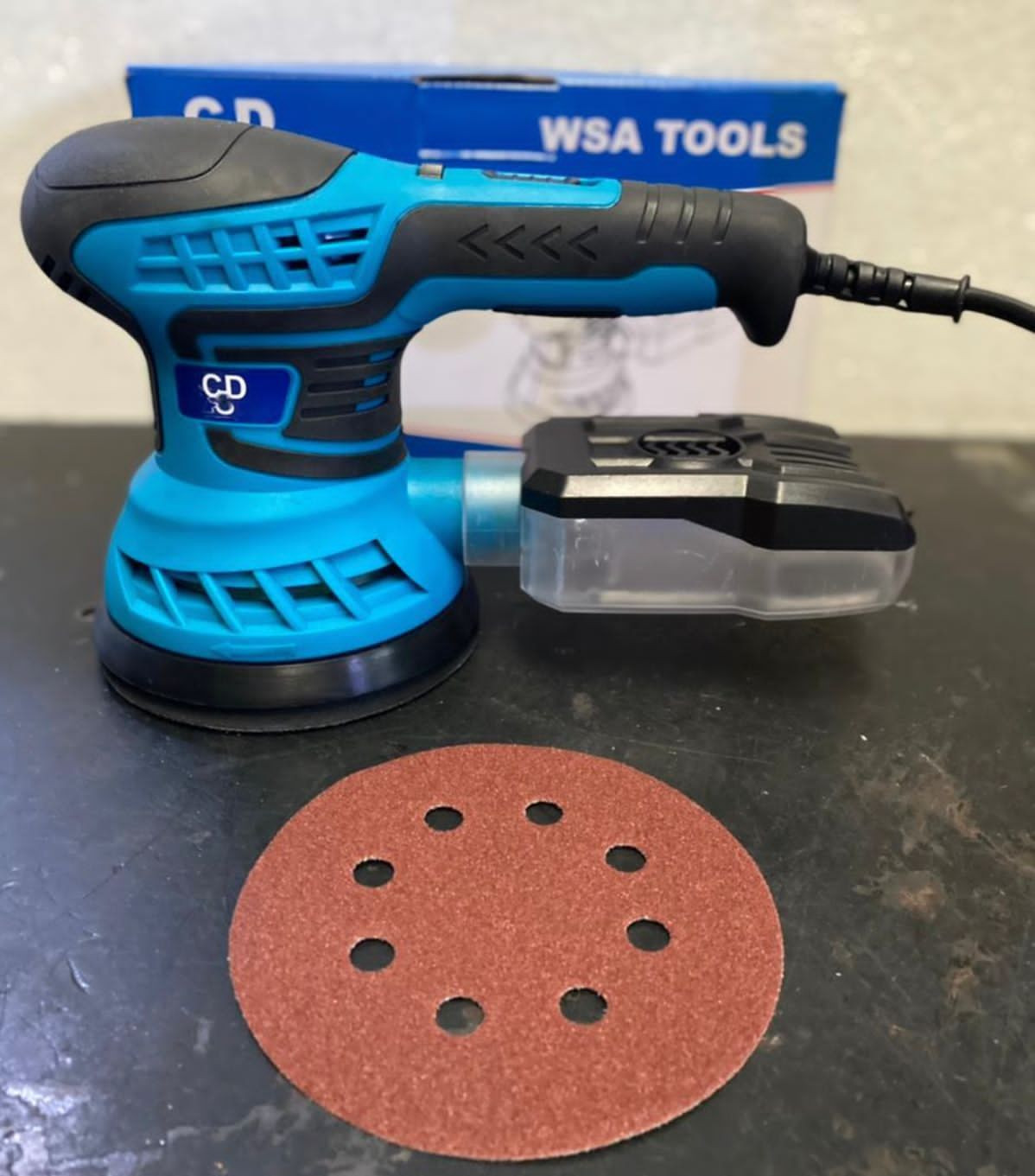 Utiliza papel abrasivo de gancho y bucle de 5 "(8 agujeros) de cambio rápido (se vende papel abrasivo por separado)