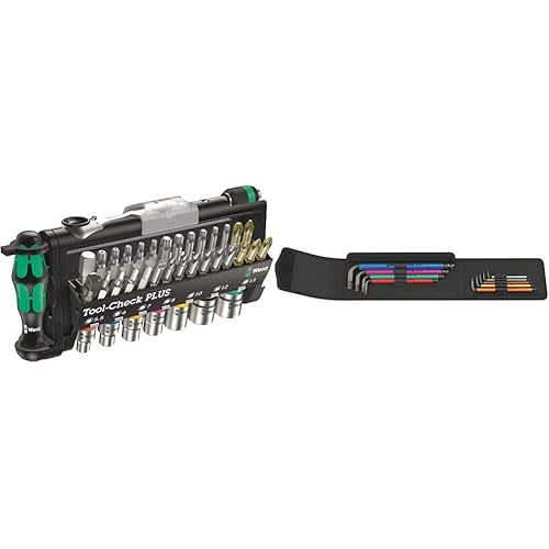 Wera 056490 Tool-Check Plus - Juego de trinquetes con enchufes, métricoHerramienta combinada compuesta por trinquete, brocas, llaves de vaso y soporte en un mínimo de espacio. Ideal como compañero universal para una gran variedad de aplicaciones de atornillado. Portabrocas de alta calidad con mango Kraftform Plus para un trabajo agradable y ergonómico que evita ampollas y callos. Zonas de agarre duras para altas velocidades de trabajo, mientras que las zonas blandas garantizan una alta transferencia de torsión. Mini trinquete para un trabajo rápido en trabajos de fijación con una herramienta eléctrica o herramientas manuales convencionales no es posible debido a un espacio insuficiente. Cambio rápido de dirección izquierda a derecha y viceversa mediante el uso de la palanca de cambio. Funcionamiento rápido posible girando la rueda del pulgar (con el pulgar) en la cabeza del trinquete. Funcionamiento más sencillo incluso con una sola mano. Cabezal de trinquete ergonómico: Geometría Kraftform con zonas de contacto perfectamente formadas para los dedos. La toma directa de la broca en el cabezal de trinquete hace que sea un diseño de mini herramienta y es ideal para bajas alturas de trabajo. El pequeño ángulo de retorno de 6° permite un trabajo preciso. Robusto diseño de acero forjado. Par de torsión de más de 65 Nm. El soporte de brocas Rapidaptor con manguito giratorio se puede utilizar como extensión, para cambio rápido de brocas sin herramientas especiales, incluso las puntas más pequeñas con una sola mano. Brocas viscosas resistentes para uso universal. Enchufes tanto para operaciones manuales como eléctricas para casi todas las aplicaciones.Wera 05022639001, Juego de llaves en L para 950 SPKL/9 SZ imperial, multicolor.El juego de llaves hexagonales Wera 950 SPKL/9 SZ SAE (imperial) está diseñado con tecnología Hex-Plus para prolongar la vida útil de los enchufes hexagonales. La tecnología Wera Hex-Plus evita el redondeo de los tornillos causados por los bordes afilados de las herramientas convencionales que llevan gradualmente la cabeza de tornillo. Las herramientas Hex-Plus proporcionan más transferencia de contacto de superficie hasta un 20% más de torsión. Funda de goma con protección para los dedos con material de fácil agarre que garantiza un trabajo cómodo y seguro. Las cuchillas endurecidas Blacklaser proporcionan una excelente superficie y protección contra la corrosión para una larga vida útil. Cuenta con bolígrafo en el brazo largo de la llave en L para insertar la herramienta rápidamente en el tornillo y trabajar en un ángulo en espacios reducidos. El material no desgaste de Wera garantiza que las llaves en L permanezcan fijas incluso después de quitarlas frecuentemente. Incluye bolsa de almacenamiento de velcro. Cada llave en L está grabada con láser con el tamaño de cada herramienta para una fácil ubicación. El juego contiene 9 llaves hexagonales en L: 5/64, 3/32, 1/8, 5/32, 3/16, 7/32, 1/4, 5/16 y 3/8 pulgadas. Juego de 9 llaves hexagonales SAE con bolsa de almacenamiento. La tecnología Wera Hex-Plus evita el redondeo del hueco del tornillo y transfiere hasta un 20% más de torsión. Funda de goma con material de fácil agarre que garantiza un trabajo cómodo y seguro.