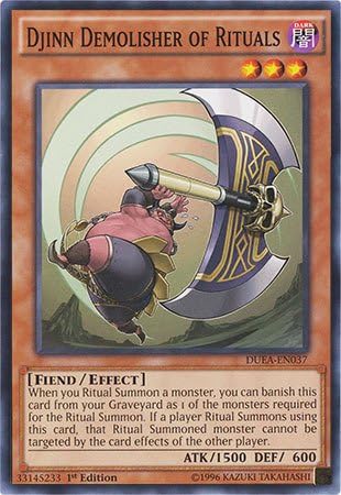 Yu-Gi-Oh! es un juego estratégico de cartas intercambiables en el que dos jugadores se enfrentan entre sí usando una variedad de cartas de monstruo, hechizo y trampa para derrotar a los monstruos de su oponente y ser los primeros en dejar caer los puntos de vida del otro a 0. Nombre de la tarjeta: Djinn Demolisher of Rituals Tipo de carta: Monstruo de efecto Número de tarjeta: DUEA-EN037 Conjunto: Alianza Duelista Atributo : Oscuro Nivel: 3 Tipo de monstruo: demonio Código de acceso: 33145233 Texto de la carta: Si Invocas por Ritual a un Monstruo Ritual, puedes desterrar esta carta de tu Cementerio como 1 de los monstruos necesarios para la Invocación Ritual El monstruo Ritual Invocado con esta carta no puede ser blanco de los efectos de la carta de tu adversario.